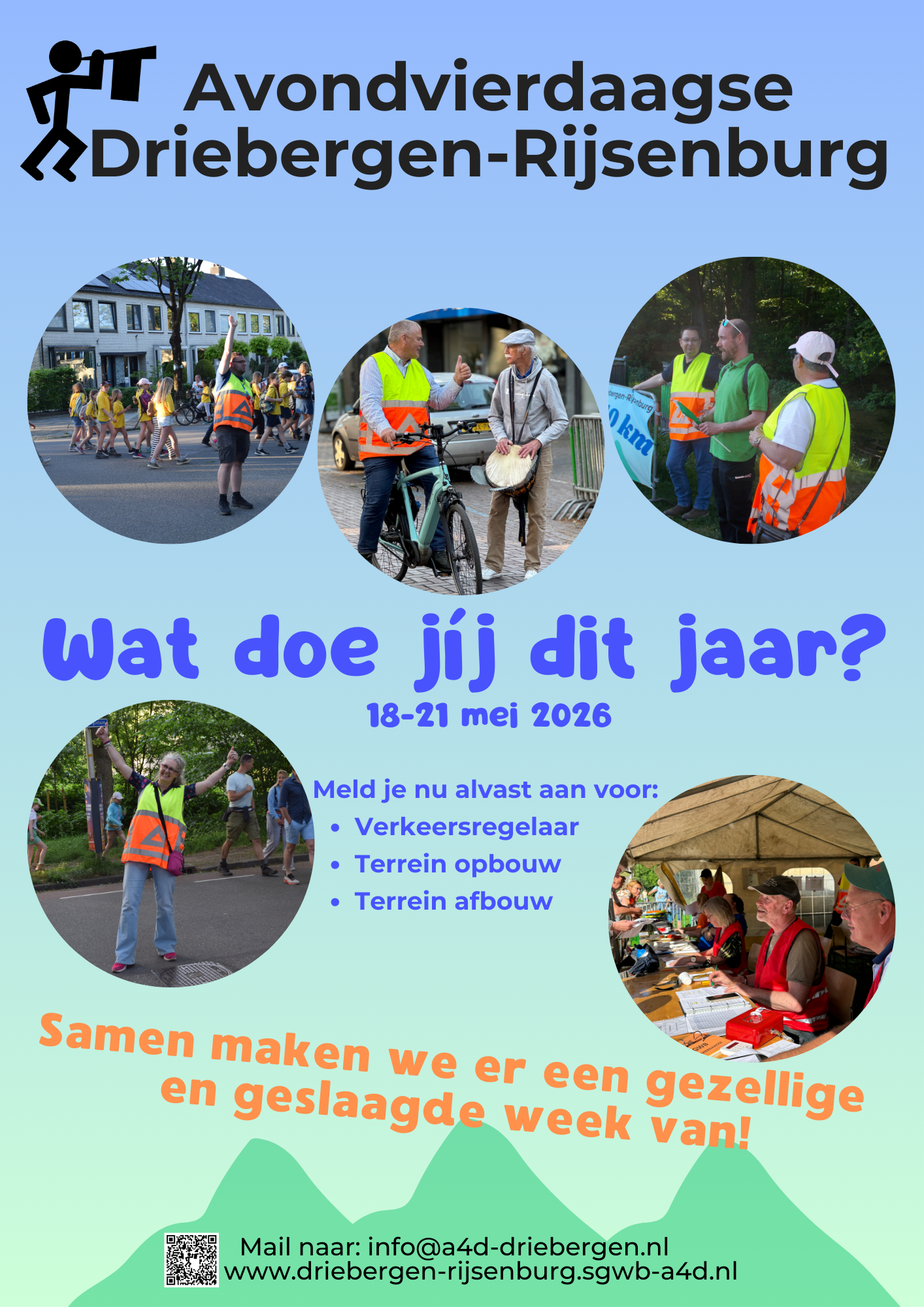 Kom jij ons tijdens de Avondvierdaagse helpen? Voor meer informatie, mail naar: Dit e-mailadres wordt beveiligd tegen spambots. JavaScript dient ingeschakeld te zijn om het te bekijken.